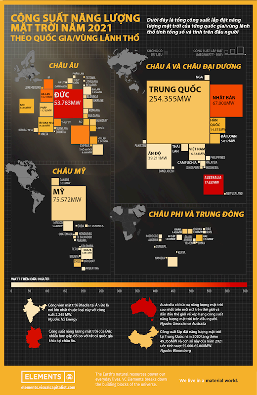 Hiện dẫn đầu thế giới về công suất lắp đặt năng lượng mặt trời là Trung Quốc 254.355 Megawatt (MW), chiếm 35,6% tổng số toàn cầu. Theo sau là Mỹ với 75.572MW, chiếm 10,6% toàn cầu. Công suất năng lượng mặt trời trên đầu người của Trung Quốc và Mỹ lần lượt là 147 và 237 Watt/người. (1 Megawatt = 1 triệu Watt).